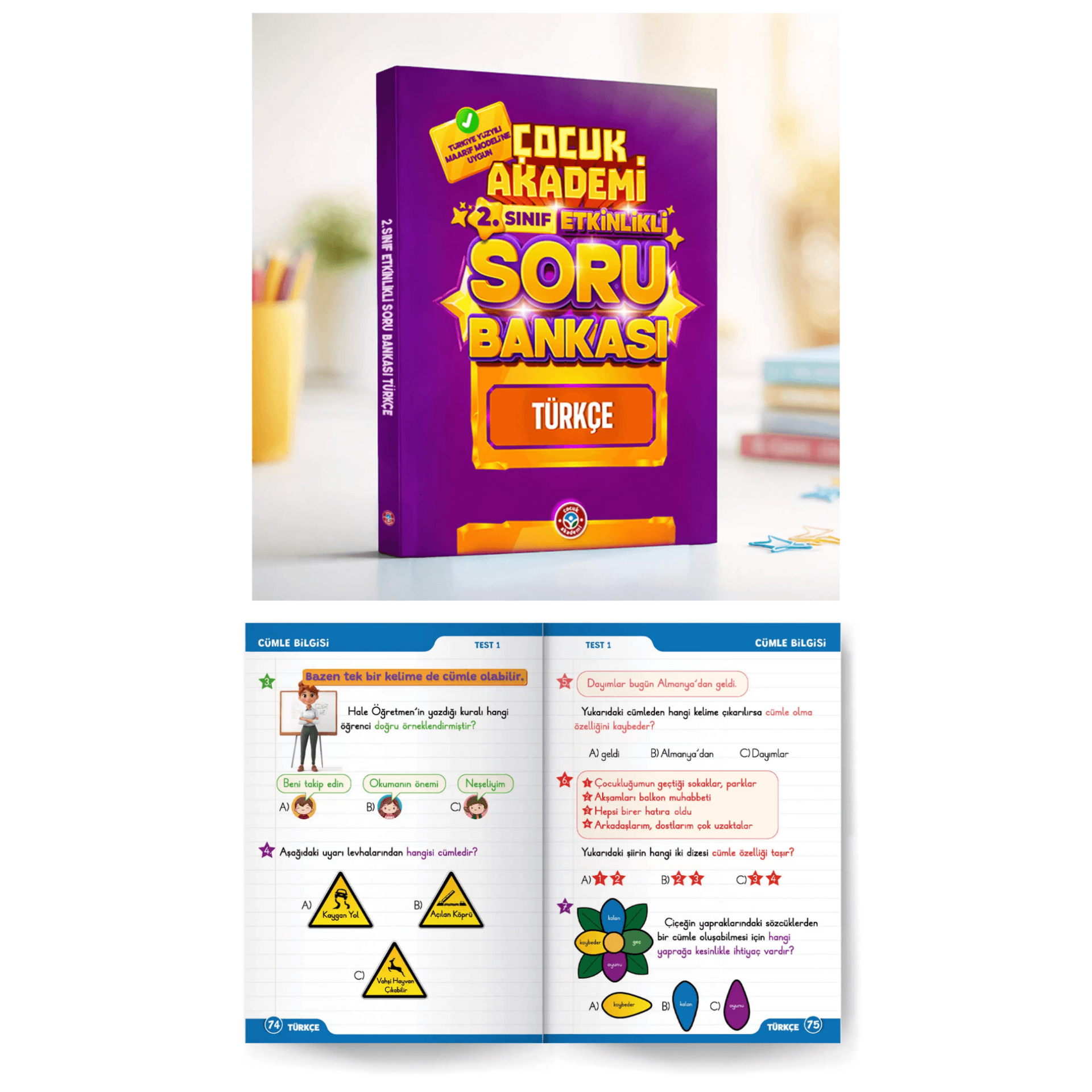Çocuk Akademi 2. Sınıf Etkinlikli Soru Bankası Türkçe kitabı, bu yolculukta çocukların sadece soru çözen değil; düşünen, keşfeden ve öğrenmekten keyif alan bireyler olmasını hedefler.