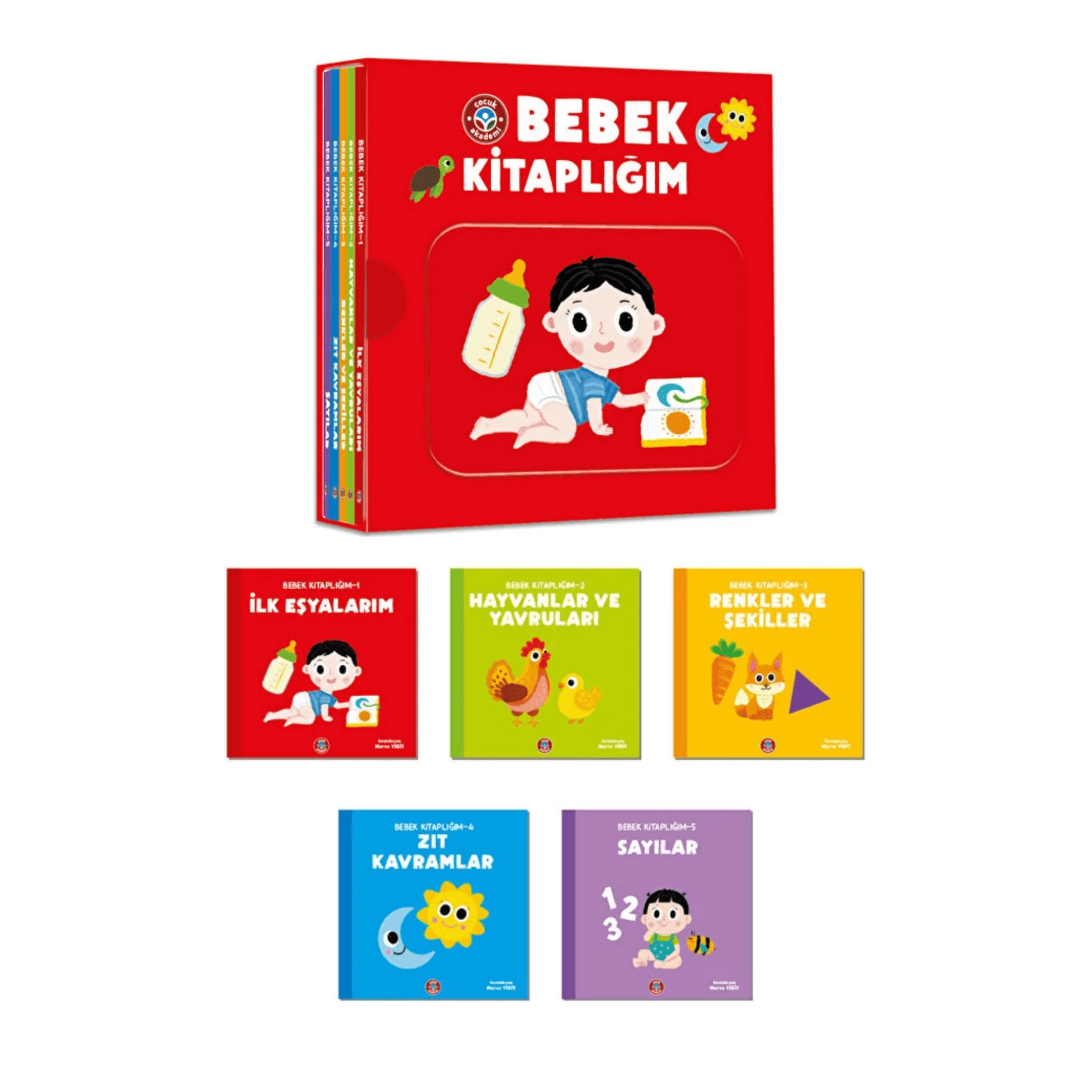 Bebek Kitaplığım, özel tasarım kutusu içerisinde 5 kitap içermektedir. Kitap isimleri: 1-İlk Eşyalarım 2-Hayvanlar ve Yavruları 3-Renkler ve Şekiller 4-Zıt Kavramlar 5-Sayılar Her kitap 12 sayfadan oluşmaktadır ve set toplam 60 sayfadır. Kalın sayfalarla hazırlandığı için dayanıklı yapısıyla uzun süreli kullanımına uygundur.