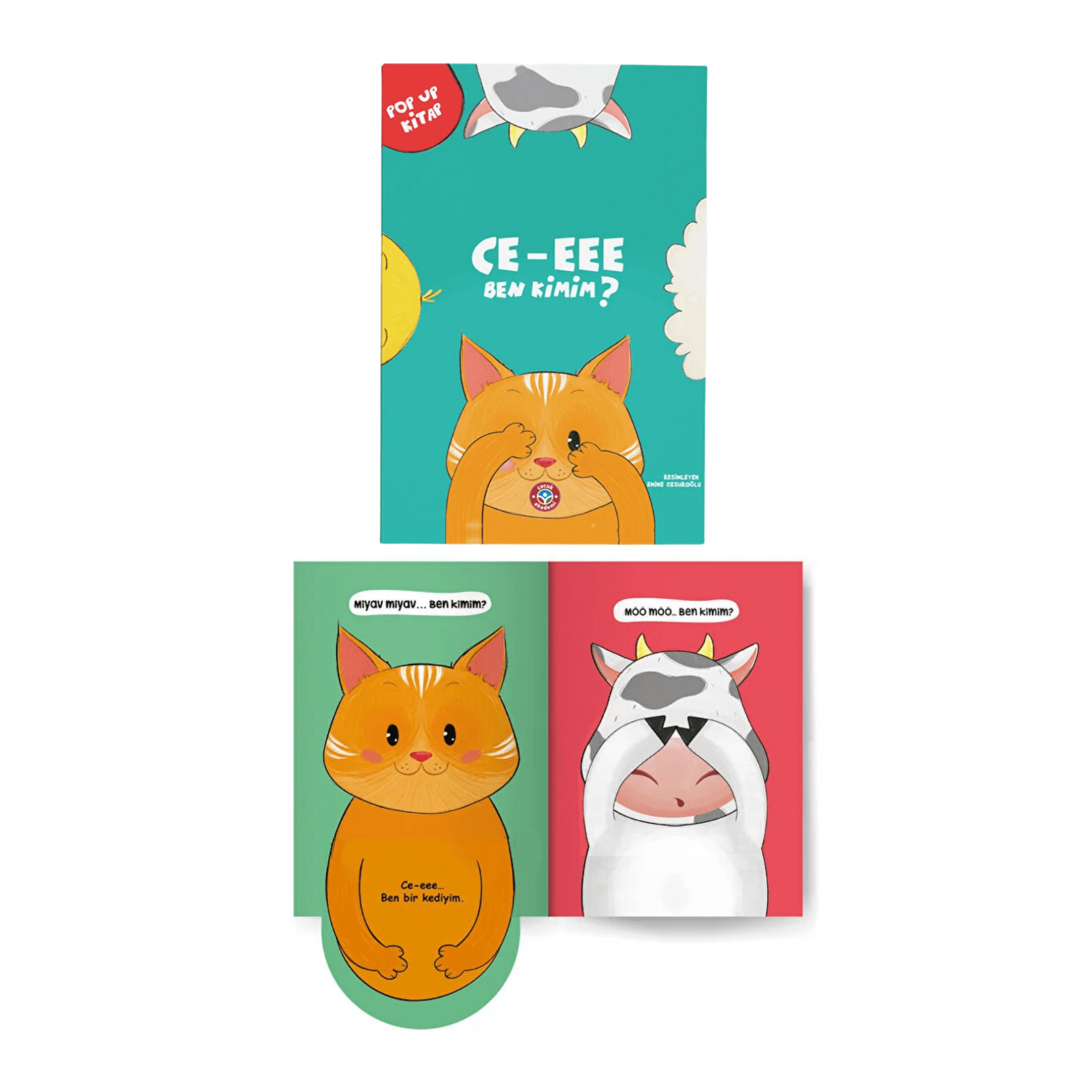 “Ce-Eee Ben Kimim?” 11 hayvan ve 1 bebeğe ait eğlenceli resimler içermektedir. Bebeklerin ilk sosyal oyunu olan ce-eee formatına uygun olarak hareketli şekilde hazırlanmıştır. Hareketli sistemi sayesinde yüzünü kapatan hayvanları ce-eee diyerek gözleri açık şekilde görebilirsiniz. Örneğin: Möö möö.. Ben Kimim?” diyerek bebeğe ses taklidi yapılabilir. Ardından bebek katlanan sayfayı açar ve “Ce-eee… Ben bir ineğim.” diyerek kitap oyuna dönüştürülür. Bu kitap bebeklerin kitaplar ile tanışması için eğlenceli bir kaynak olacaktır. İçerisinde kedi, koyun, aslan, maymun gibi hayvanlara ve bebeğe ait resimler en eğlenceli hali ile çizilmiştir.