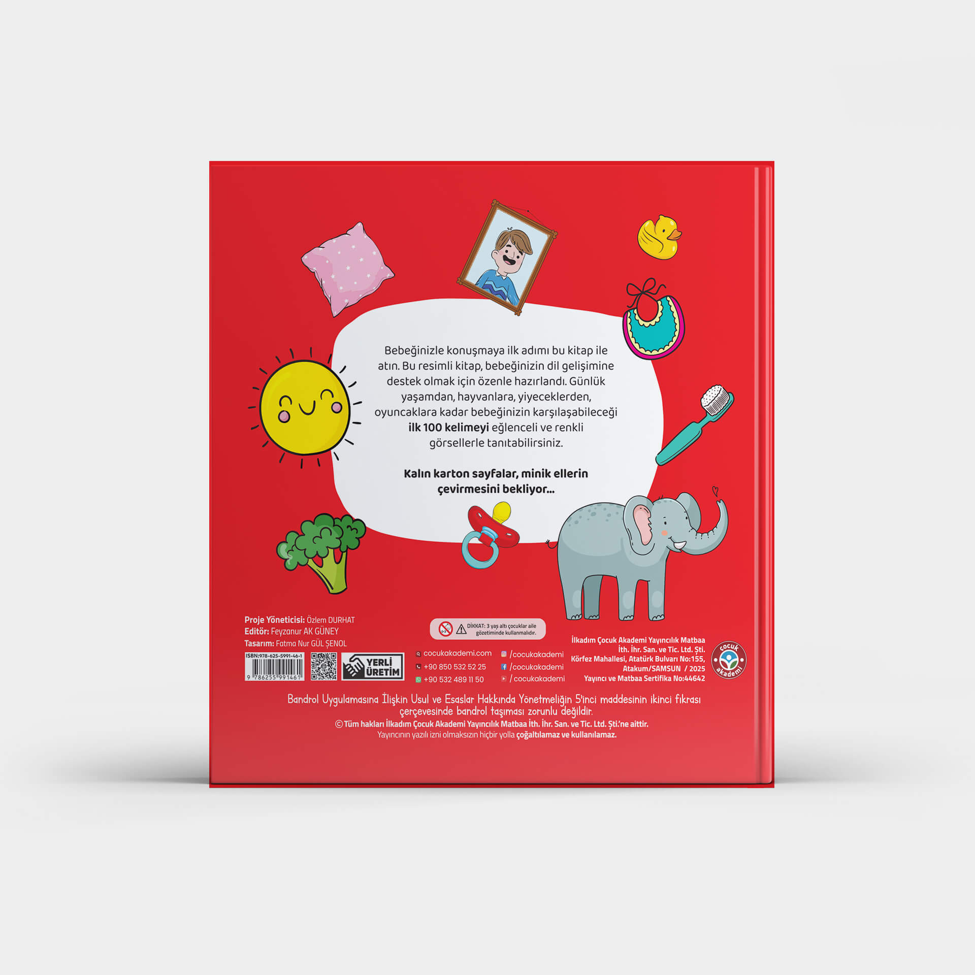 Bebeklerin ilk resimli sözlüğü olan Bebeğimin İlk 100 Kelimesi, 1 yaş ve üzeri çocuklar için tasarlanmıştır. Kalın ve dayanıklı yapısıyla uzun süreli kullanıma uygundur. Uzman Çocuk Psikoloğu ve Çocuk Gelişimci eşliğinde hazırlanan 10 sayfada 100 eğlenceli görsel bulunmaktadır. Bu görseller bebeklerin tanıyacağı ilk eşyalar, hayvanlar, giysiler, meyve-sebze gibi temalardan oluşmaktadır. Büyük, net ve renkli resimler bebeklerin dikkatini çeker; dikkat süresini artırır.