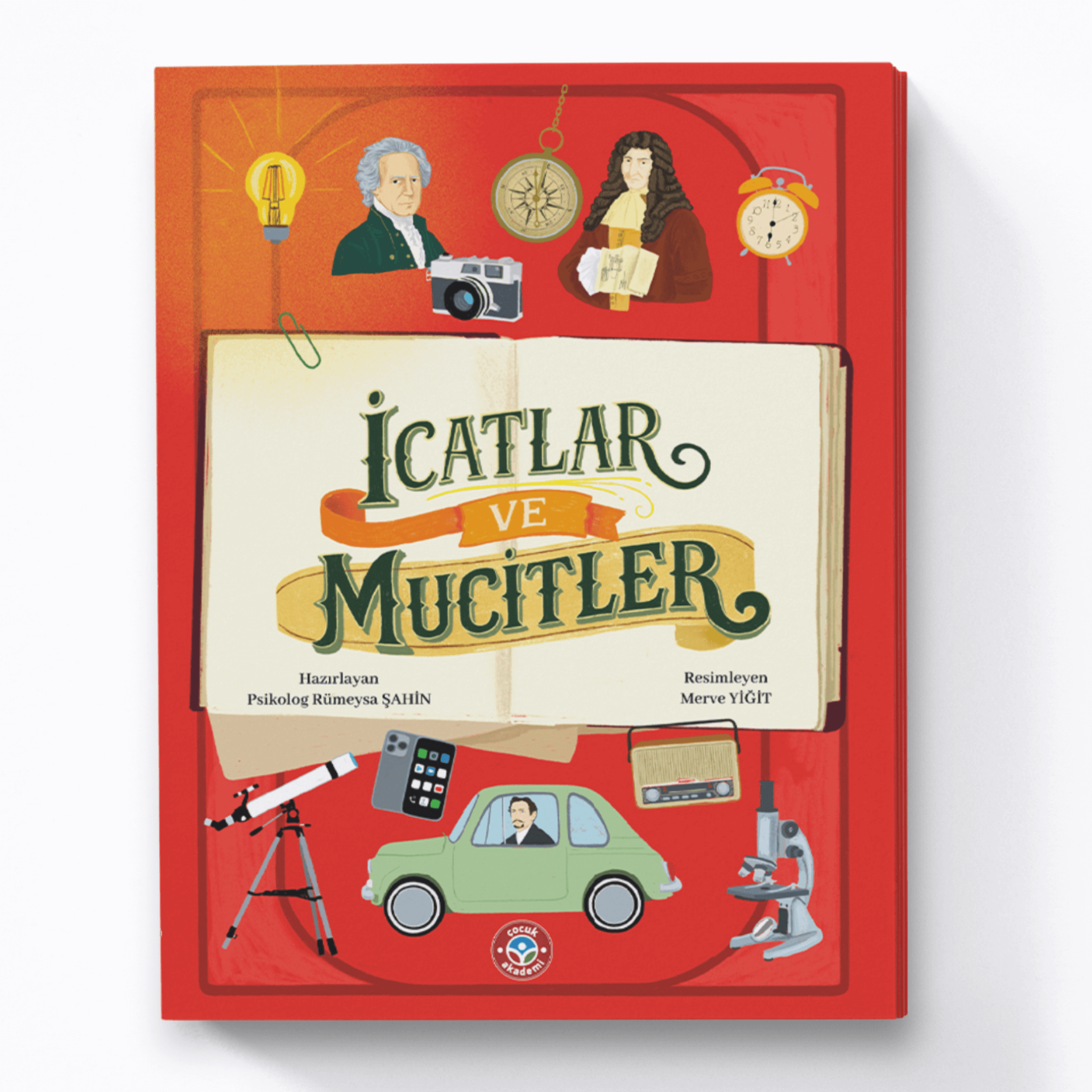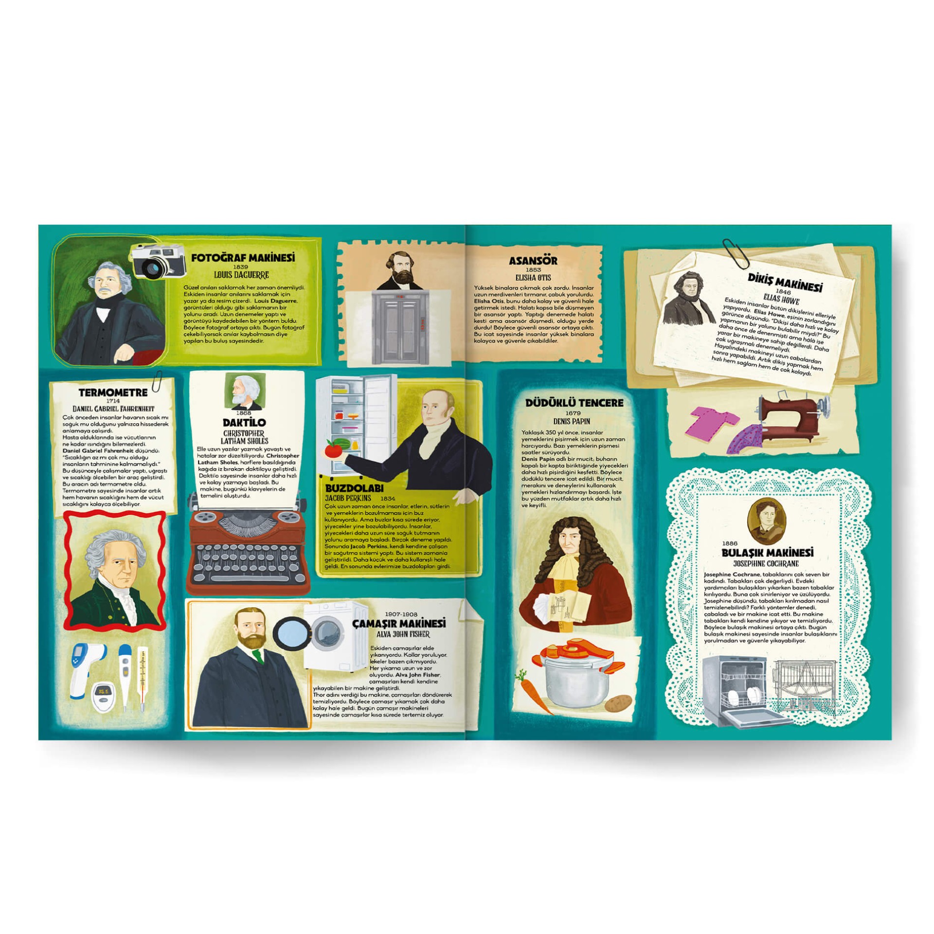 Bu renkli ve kalın kitap, dünyayı değiştiren icatların heyecanlı yolculuğunu anlatıyor. Küçük bir fikrin ya da merakın nasıl bir keşfe dönüştüğünü ve hayatımızı nasıl kolaylaştırdığını çocuklara sade bir dille aktarıyor. Kitapta yer alan 41 icat ve bu icatların mucitleri, özgün çizimlerle oluşturulmuştur.