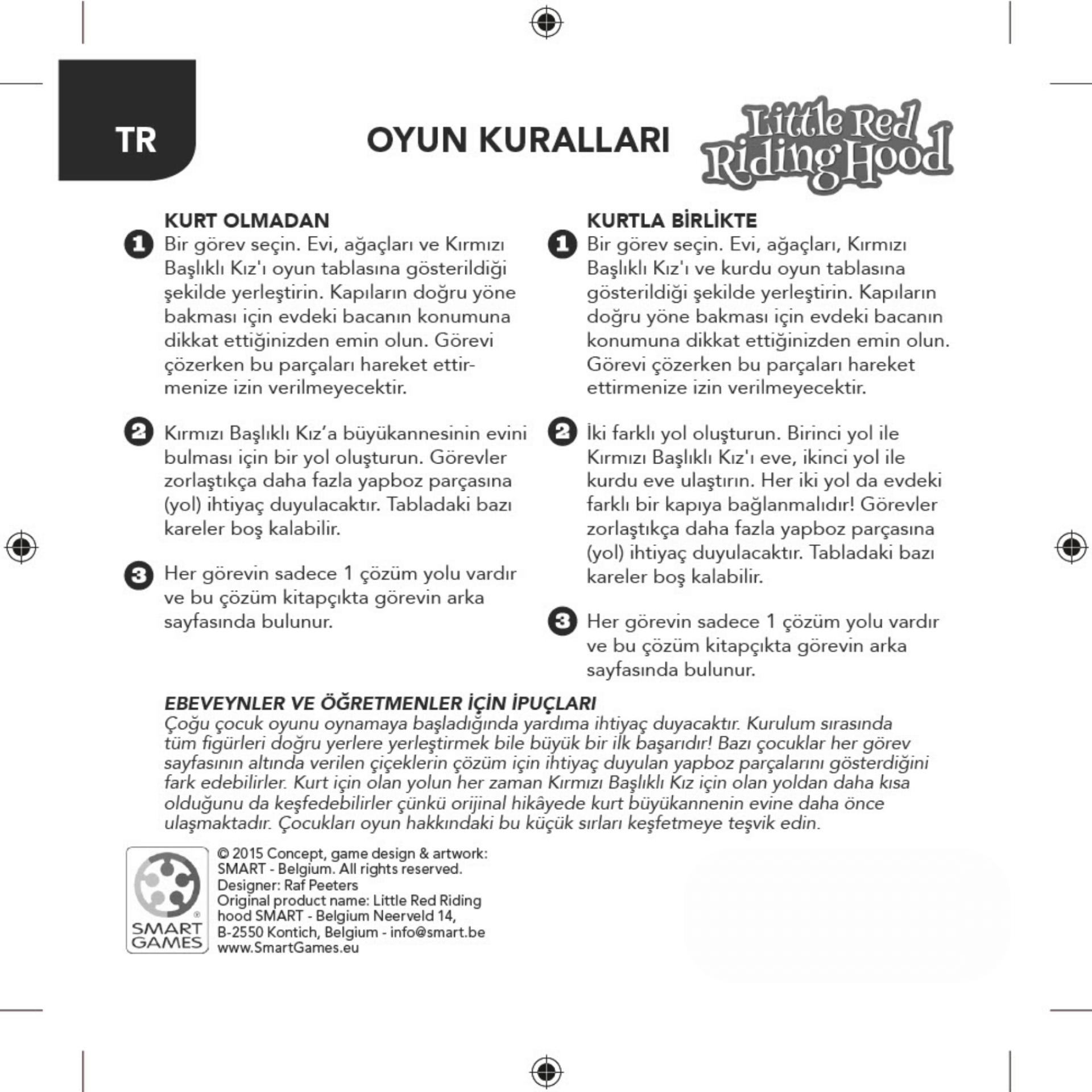 Kırmızı Başlıklı Kız'ın büyükannesinin evine ulaşması için bir yol oluşturacak şekilde tüm taşları tahtaya yerleştirebilir misin? Ama dikkat edin, kurt oraya Kırmızı Başlıklı Kız'dan daha hızlı varabilir! Büyükannenin evine giden iki yol yaparak bu zorlukları çözmeye çalışın: biri Kırmızı Başlıklı Kız için, diğeri Kurt için. Oyun kolaydan zora 48 görev (24'ü Kurtlu, 24'ü Kurtsuz) içeriyor ve orijinal öyküye modern bir yorum getiren aile dostu bir resimli kitapda kutu içeriğinde sunulmakta. Konsantrasyon, planlama, problem çözme, uzamsal algı ve görsel algı gelişimi için..