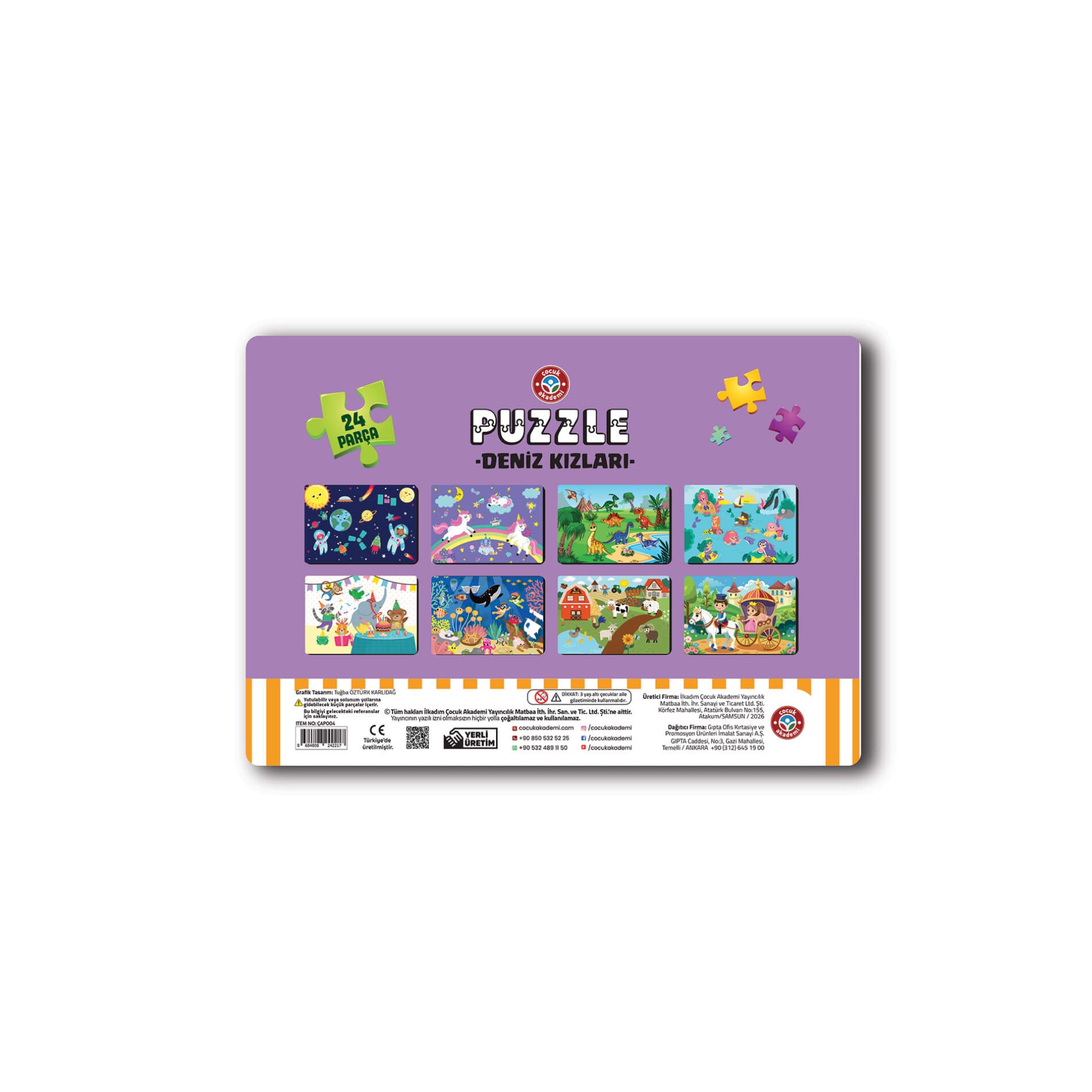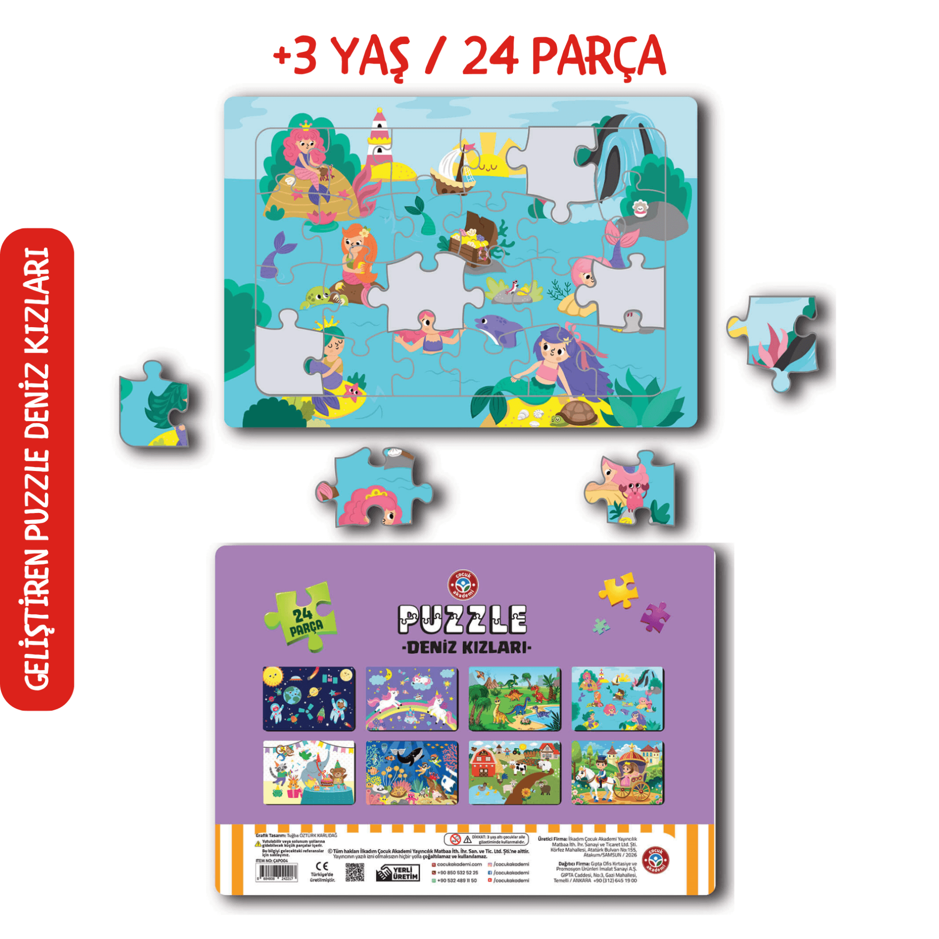 21×30 cm ölçüsündeki bu özel puzzle, çocukların kolayca kavrayabileceği 24 parçadan oluşur. Renkli ve dikkat çekici deniz kızı görselleri sayesinde çocuklar oyun oynarken parça birleştirmeyi öğrenir, görsel dikkatlerini geliştirir. Çocuk Akademi Puzzle serisinde 8 farklı çeşitte puzzle bulunmaktadır.