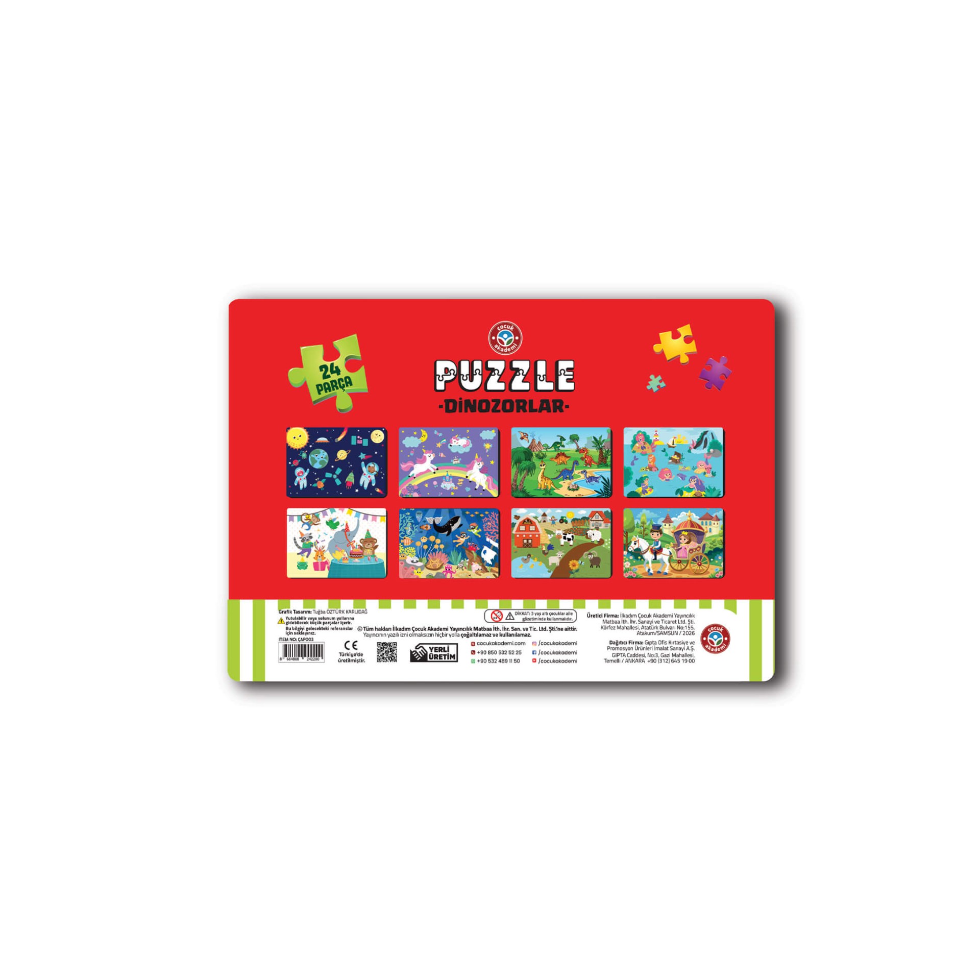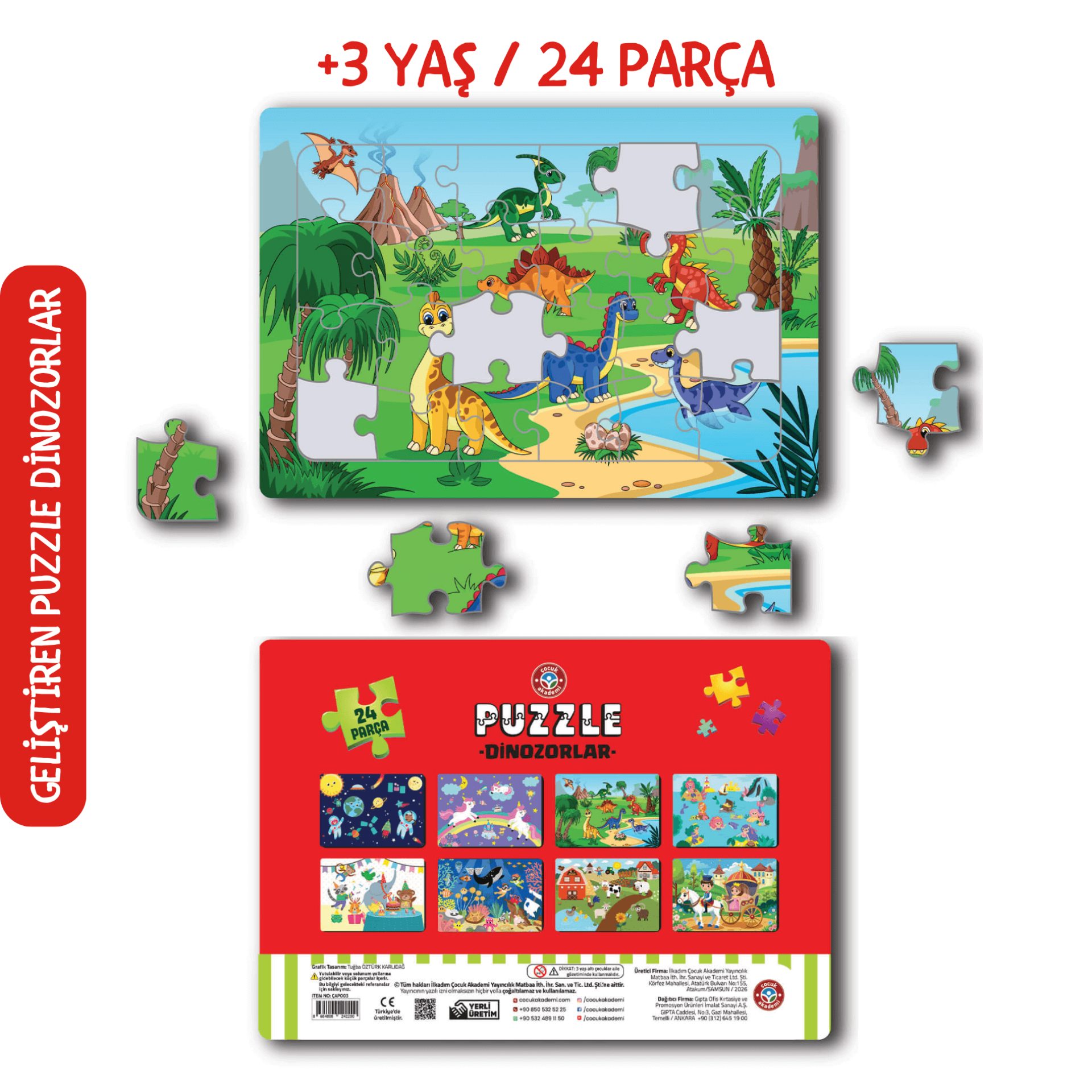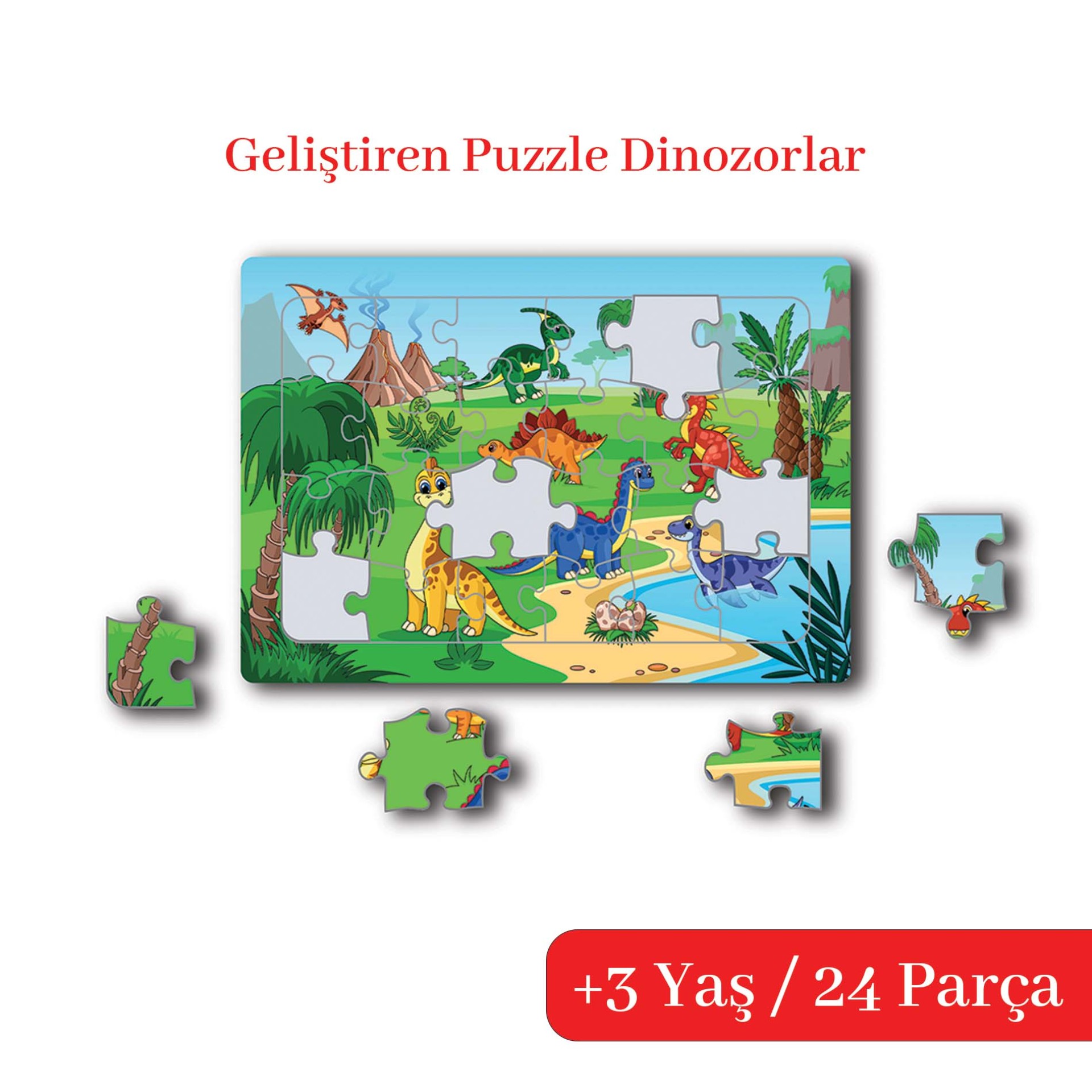 21×30 cm ölçüsündeki puzzle, çocukların rahatça kavrayabileceği 24 parçadan oluşur. Sevimli dinozor görselleriyle çocukların ilgisini anında çeker, oyunu keyifli bir öğrenmeye dönüştürür. Çocuk Akademi Puzzle serisinde 8 farklı çeşitte puzzle bulunmaktadır.