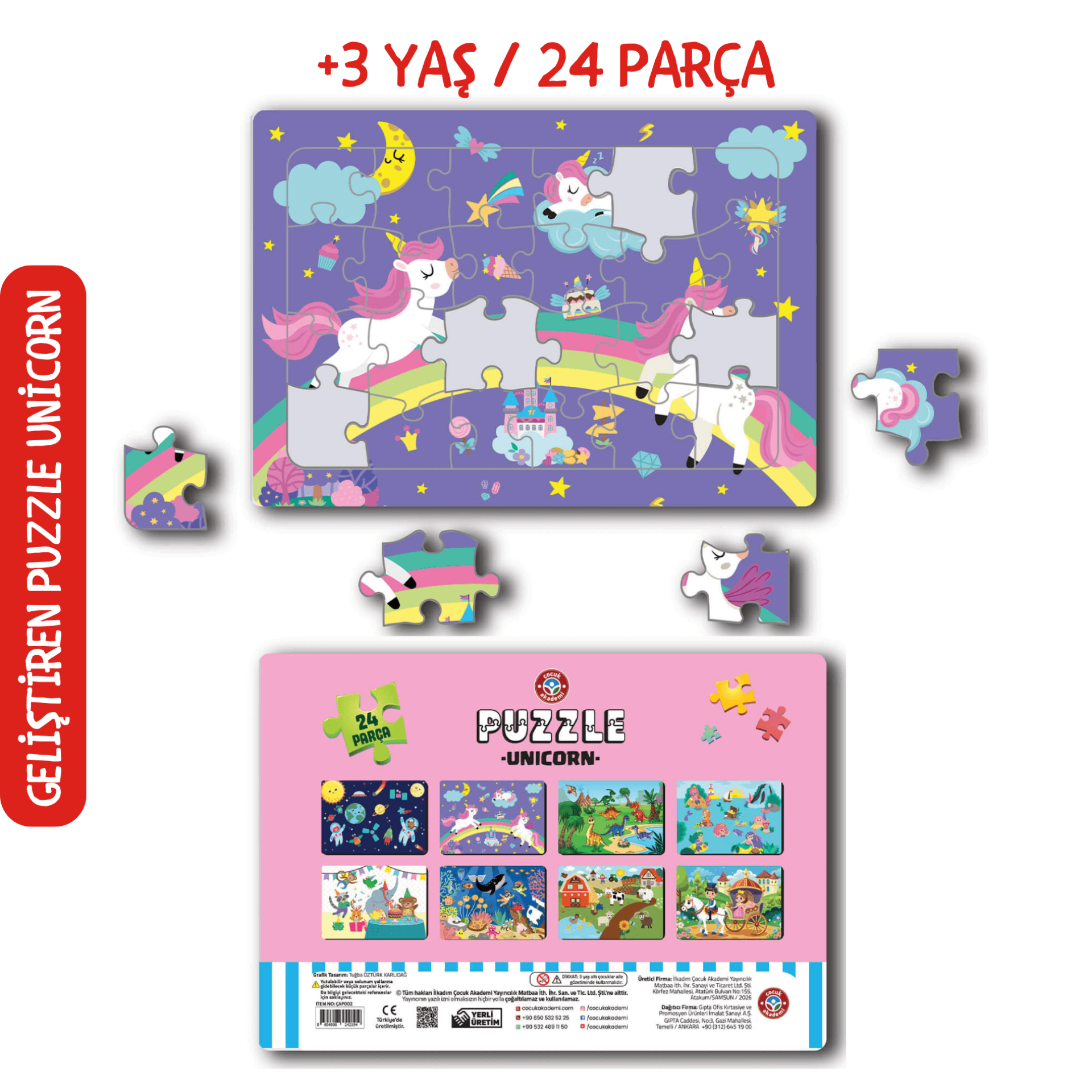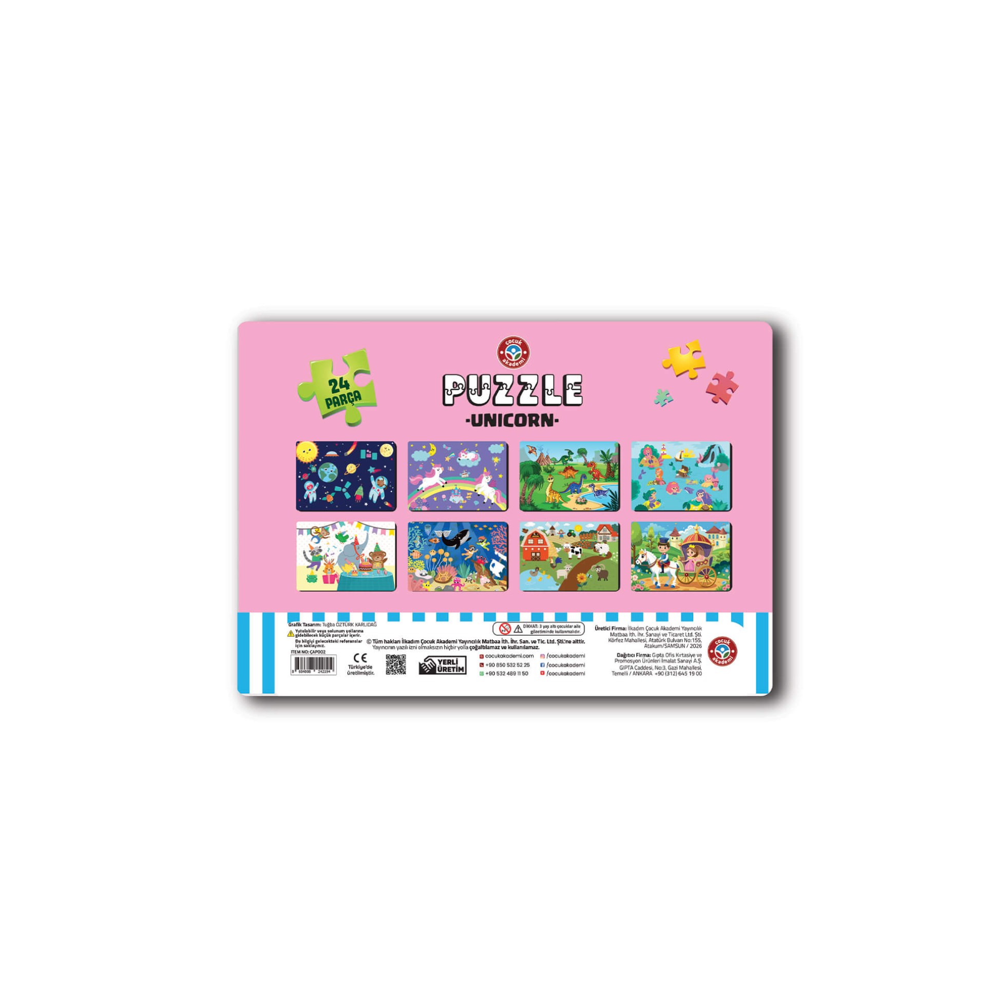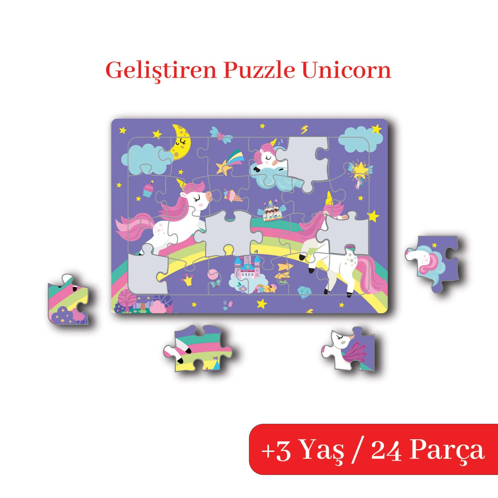 21×30 cm ölçüsündeki puzzle, çocukların rahatça kavrayabileceği 24 parçadan oluşur. Sevimli unicorn görselleriyle çocukların ilgisini anında çeker, oyunu keyifli bir öğrenmeye dönüştürür. Çocuk Akademi Puzzle serisinde 8 farklı çeşitte puzzle bulunmaktadır.