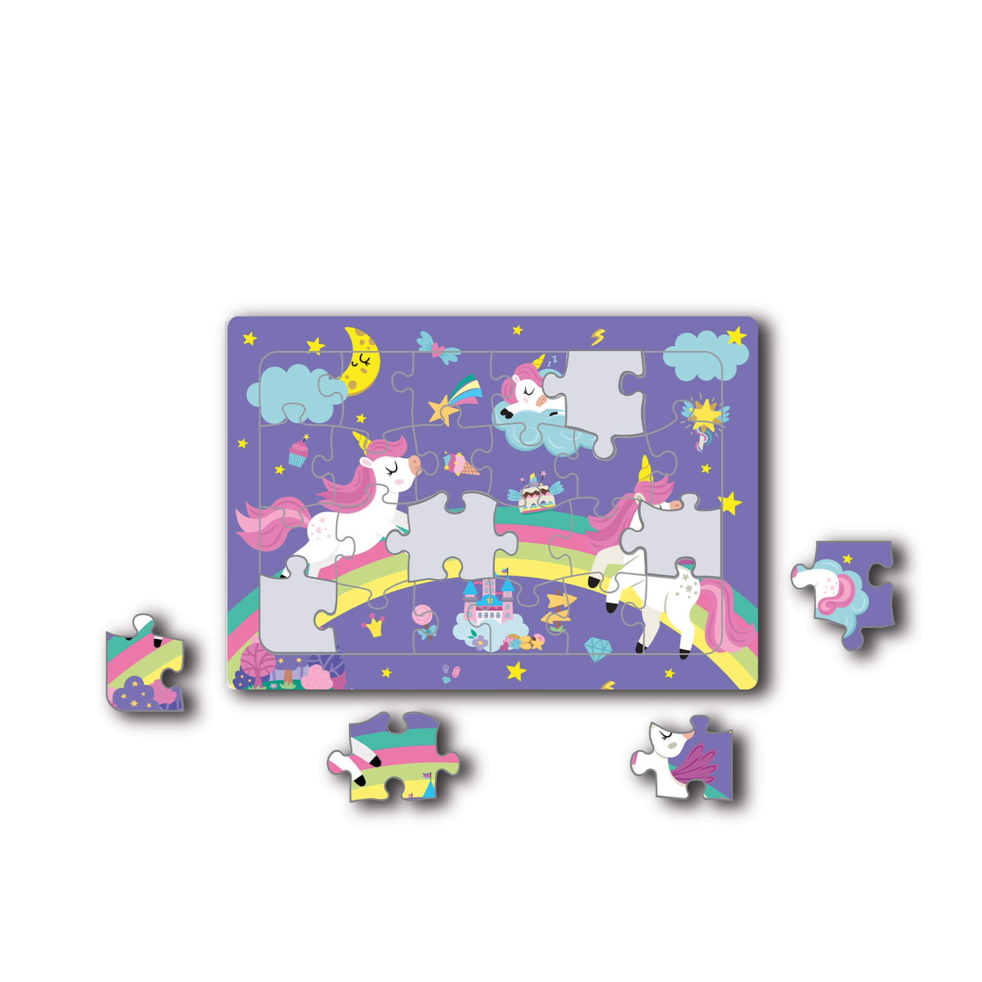 *Parçaları birleştirdikçe unicorn temalı sahne yavaş yavaş ortaya çıkar ve oyun keyifli bir öğrenme sürecine dönüşür.