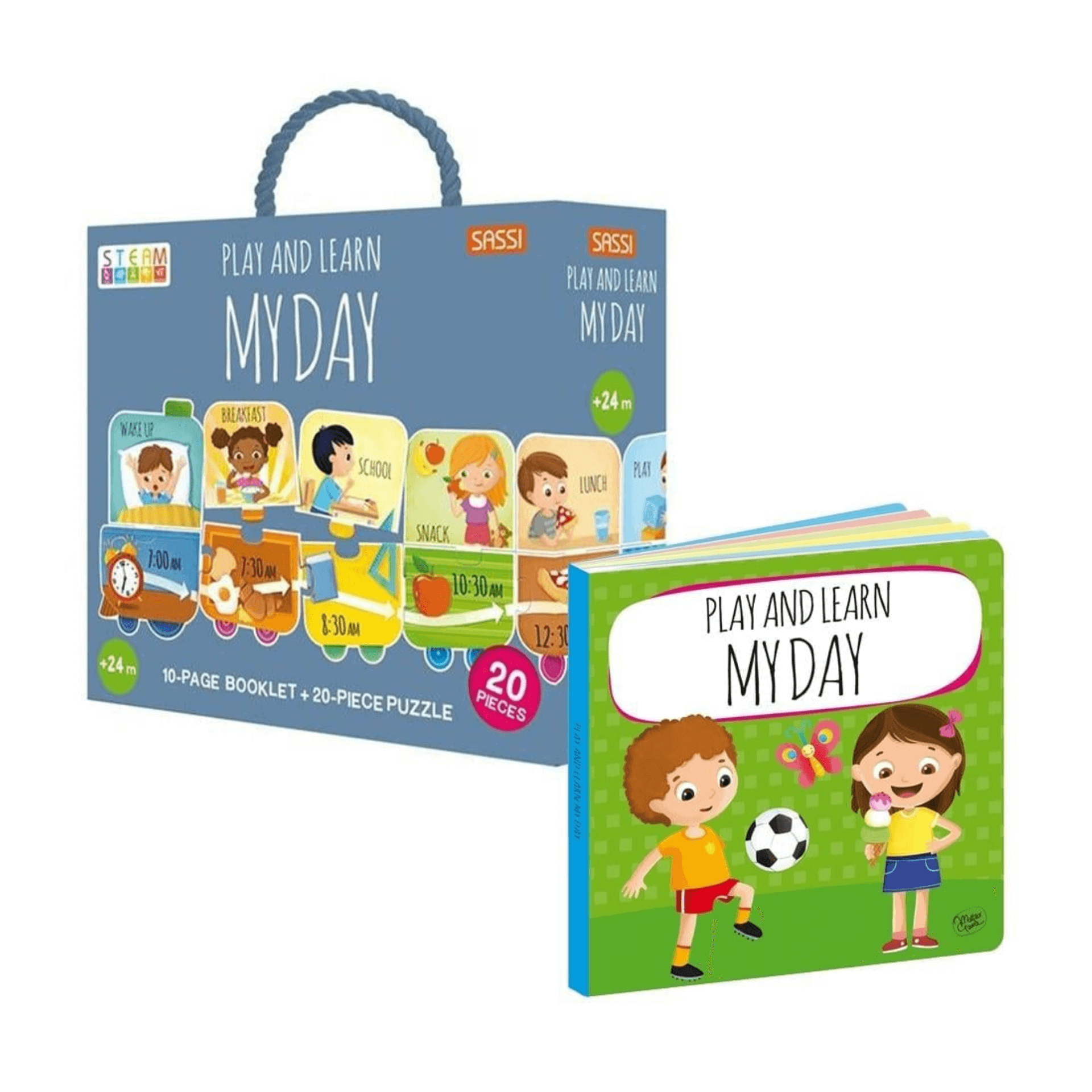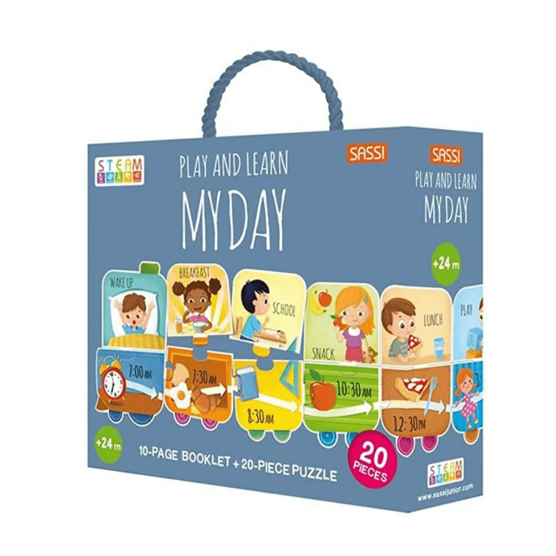 10 sayfalık bir kitap ve günün anlarını öğrenmeyi teşvik eden 20 büyük parça puzzle'dan oluşan bir tren seti. Tren seti bir metre uzunluğunda!