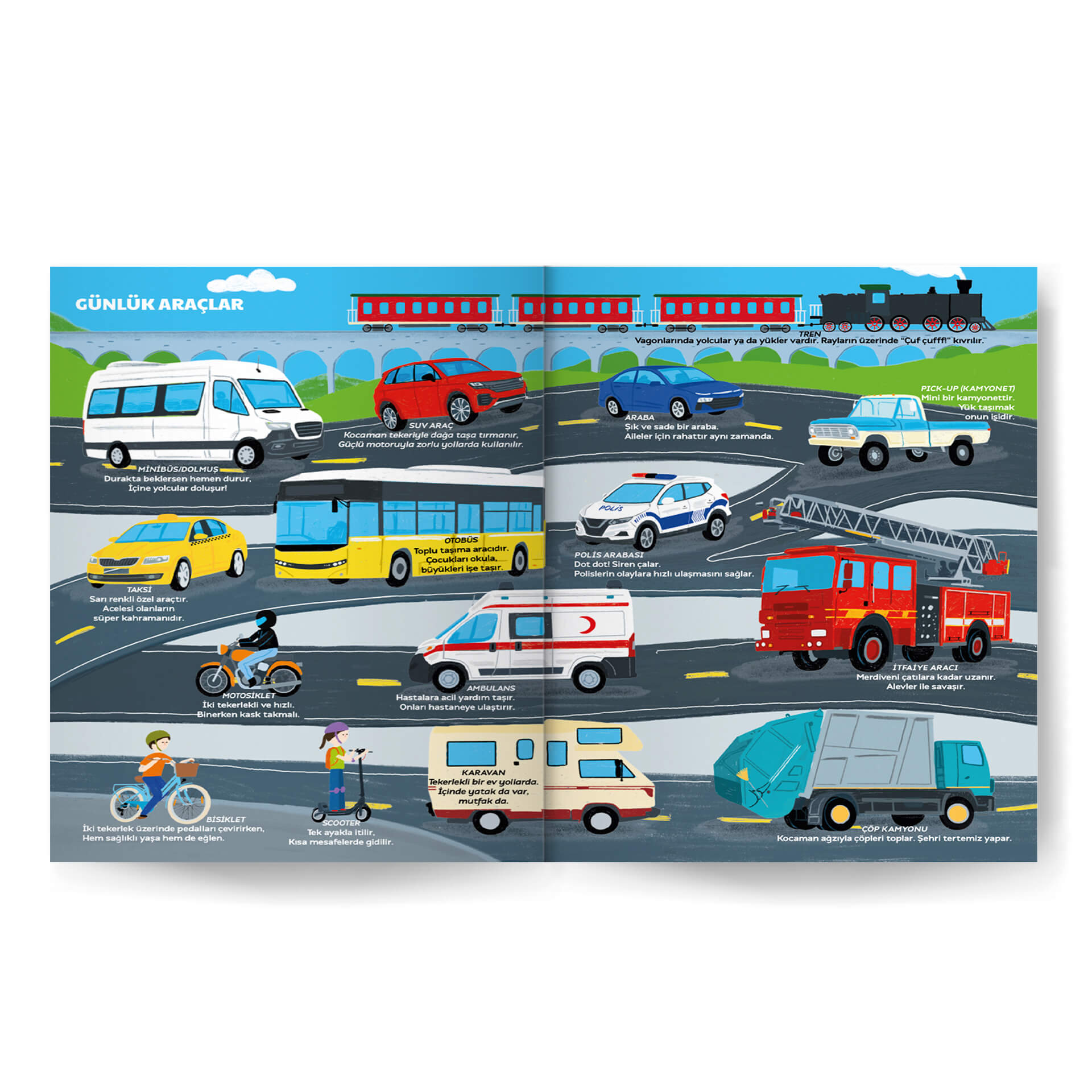 *İncelemek istenen sahneyi açın. Kitabı çocuğunuzla birlikte incelerken taşıtların isimlerini söyleyebilirsiniz.